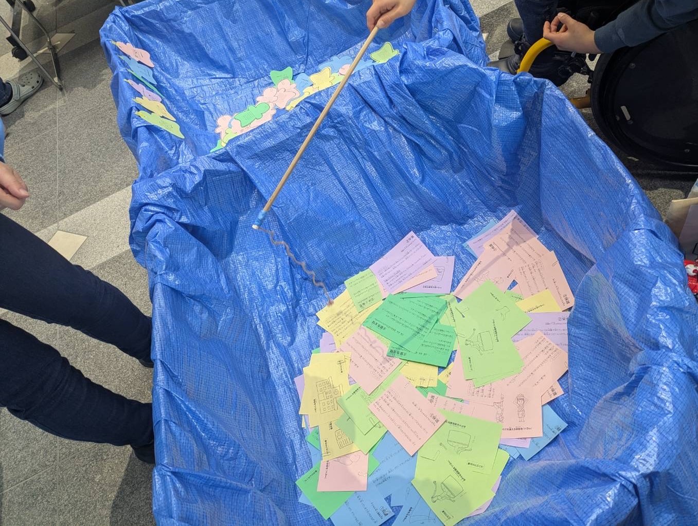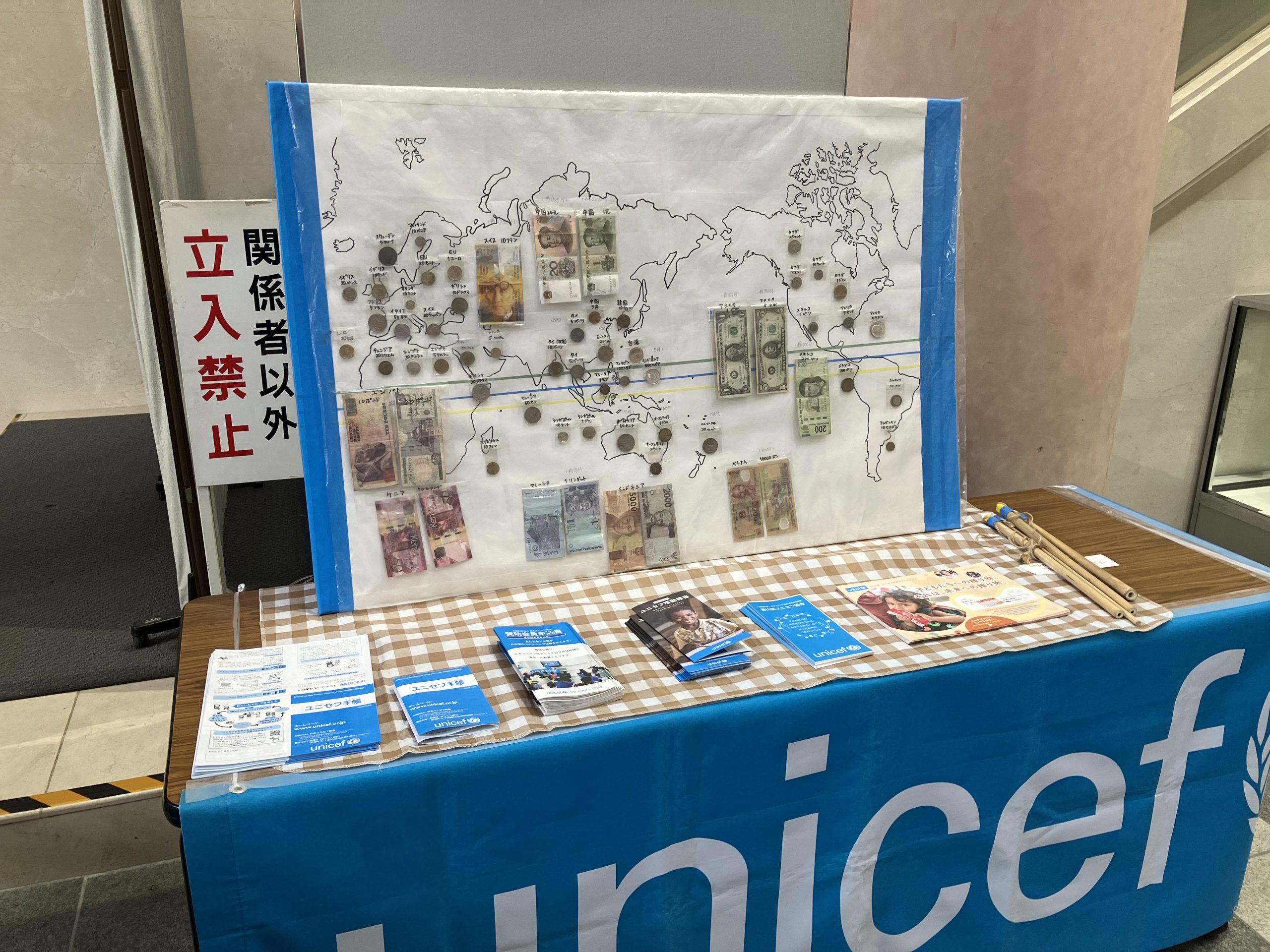 内容は、ユニセフのしごとについて書かれたカードをつり上げる「つりゲーム」と、世界地図上でいろいろな国のお金を紹介している「世界のコイン」パネルでした。